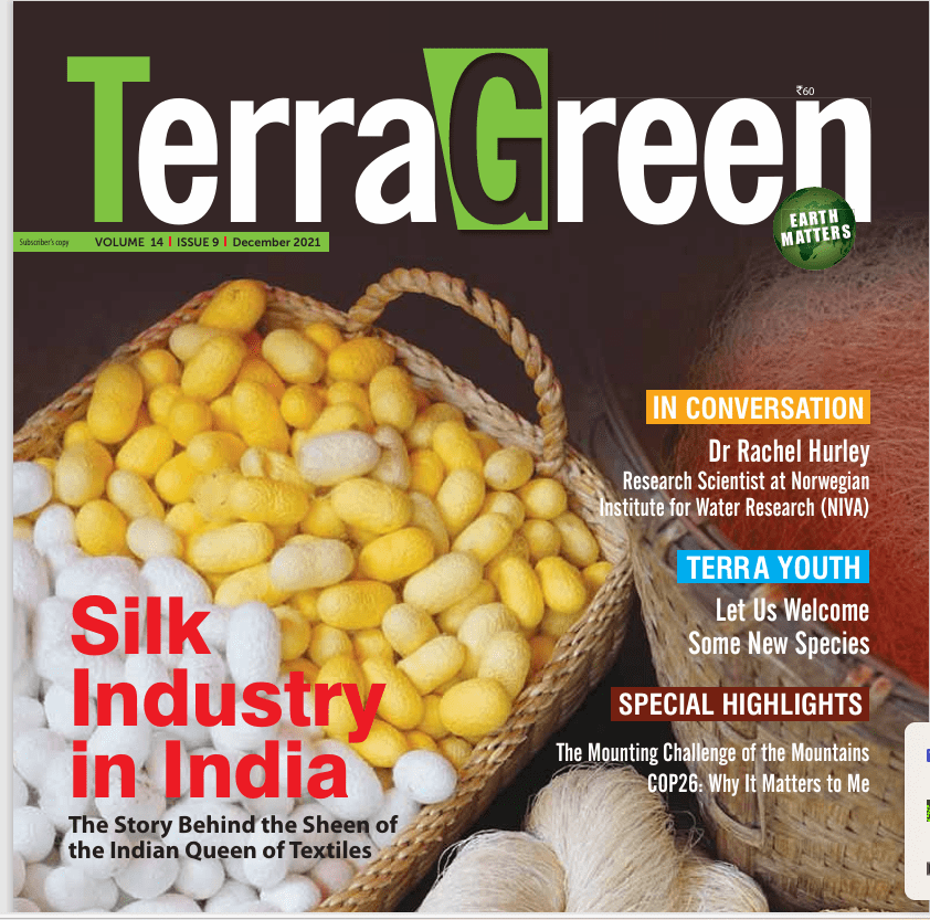 The story on silk production in India was published in TerraGreen magazine of TERI Press as a cover story in Dec 2021. The article can be viewed on the TERI website at this link