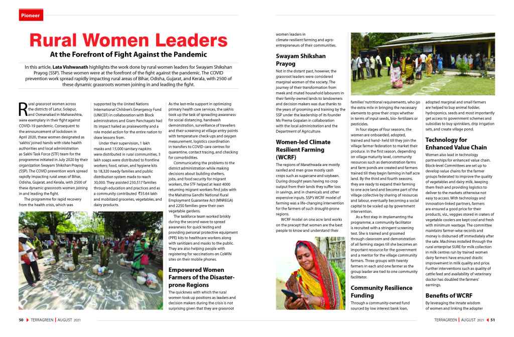 Rural grassroot women across the districts of Latur, Solapur, Osmanabad in Maharashtra, were exemplary in their fight against Covid pandemic Consequent to the announcement of lockdown in Aril 2020, these women designated as Sakhis joined hands with state health authorities and local administration as Sakhi Task Force team for the program initiated in July 2020 by their organisation Swayam Shikshan Prayog (SSP). The covid prevention work spread rapidly impacting rural areas of Bihar, Odisha, Gujarat, and Kerala, with 2500 of these dynamic grassroots women joining in and leading the fight.